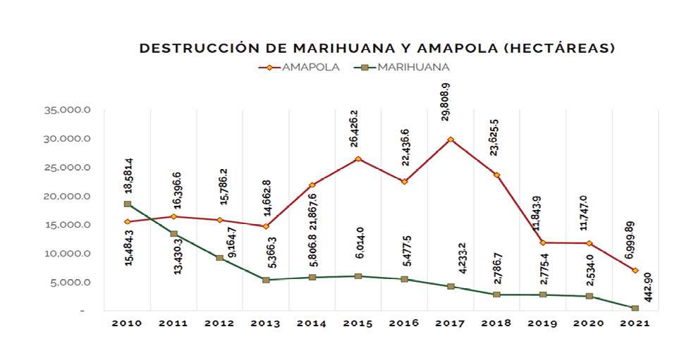 Gráfica 2: Destrucción de Cultivos de Marihuana y Amapola en México, 2010-2021 (Hectáreas).